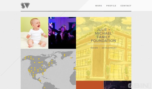 Steve Vorass 利用“隱藏導航”展示了他的各種項目。投資組合類型的網站使用一種在屏幕頂端的簡單的“工作、概要、聯系”導航,同時圖像也是導航工具。每張不同類型的圖像將帶你到不同的項目。更重要的是,當你的鼠標懸停在圖片上時,他們會提醒你點擊后將帶你到哪里。網站的整體設計有一種簡單的外觀和意想不到的像墻一樣的動畫效果。